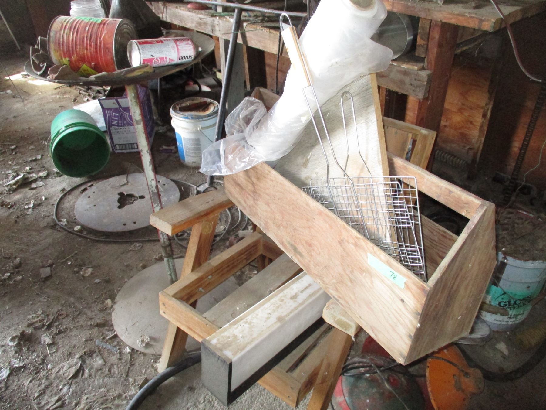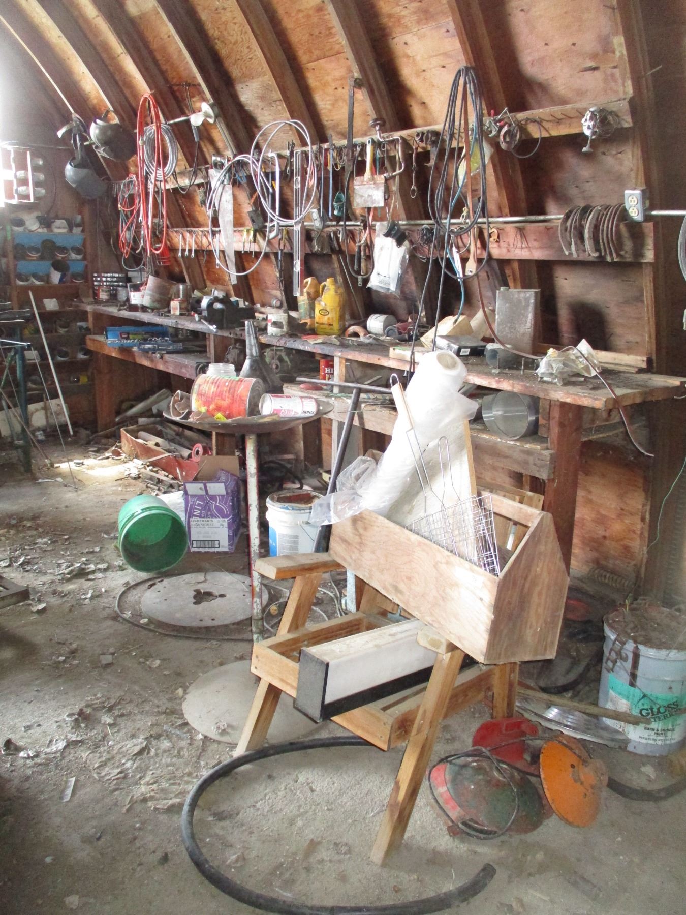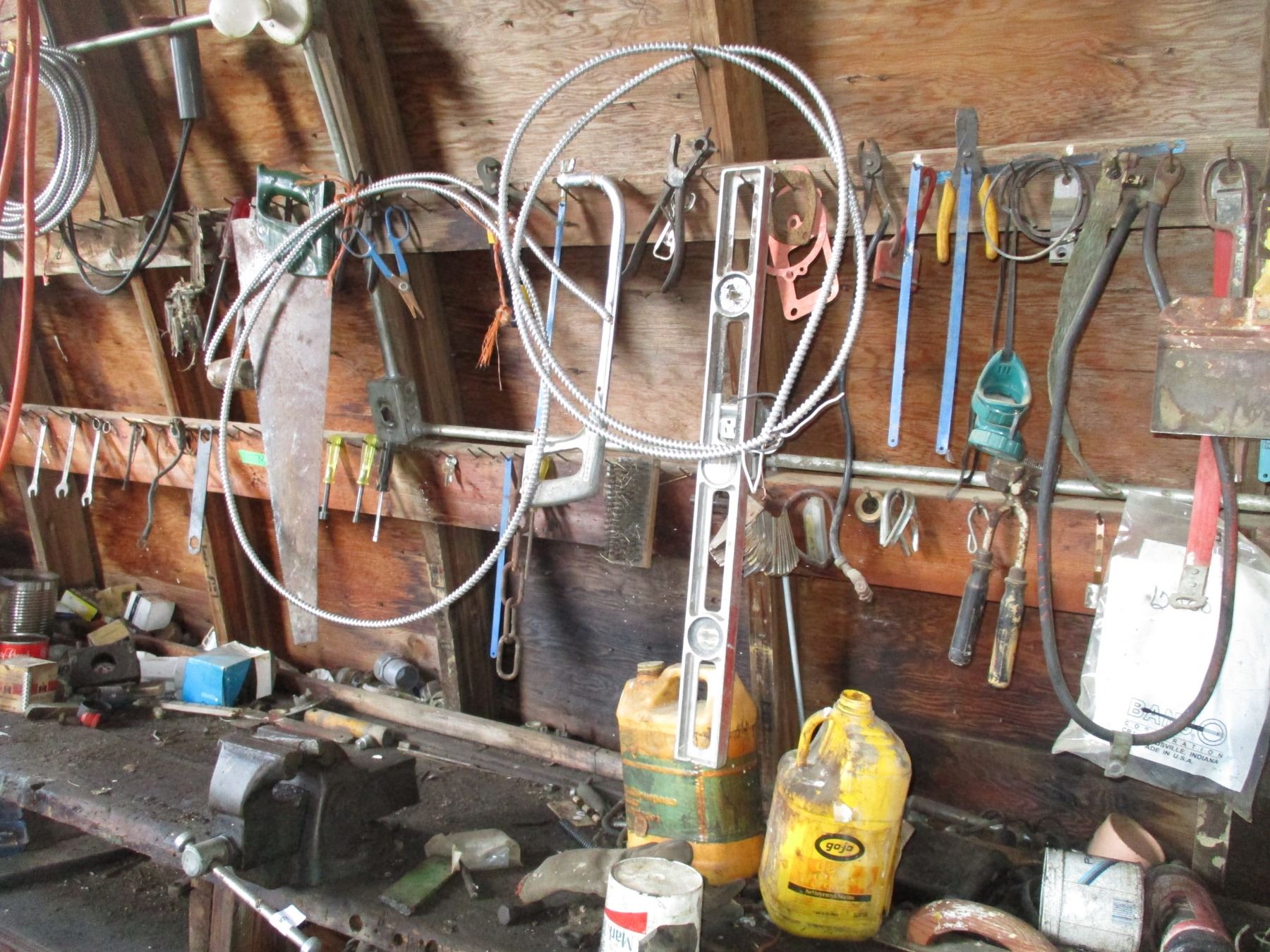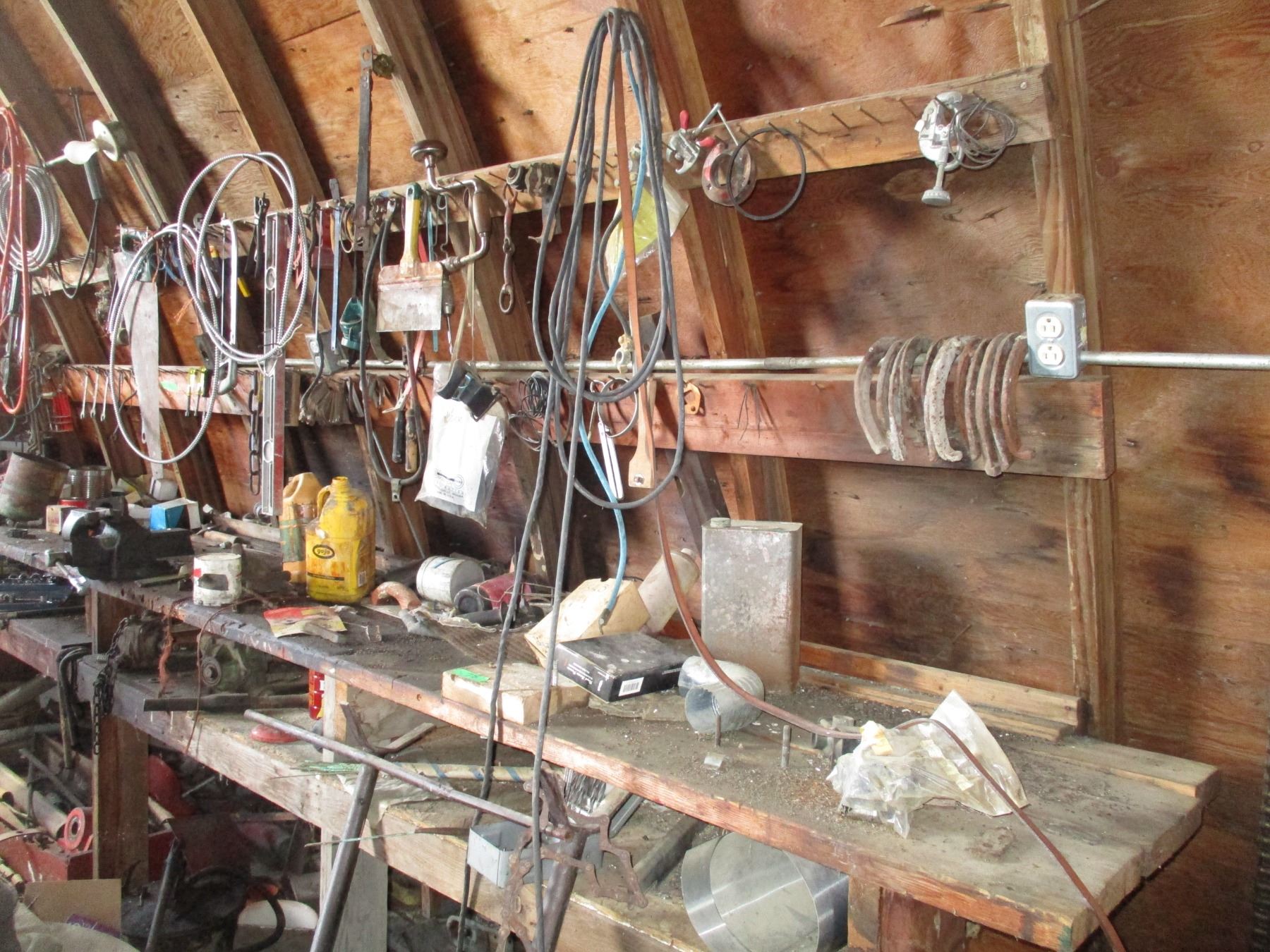 LOT - Work bench with wall contents - metal stand + (2) vises, wrenches, bolt bin, scrap iron, etc (large lot!)