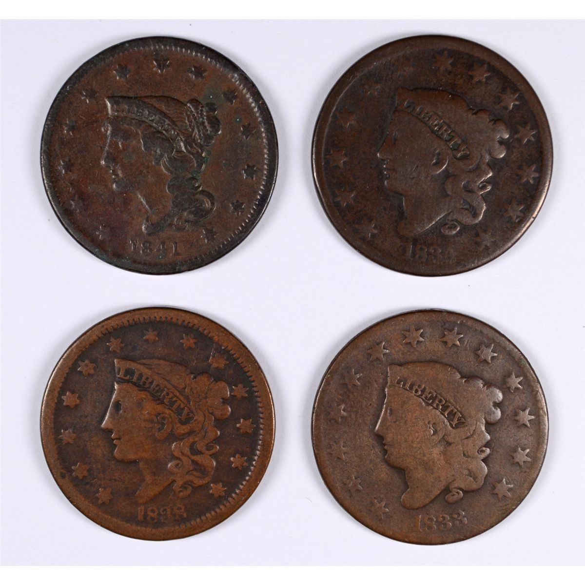 LOT of (4) LARGE CENTS, 1833, 1834, 1838, 1841