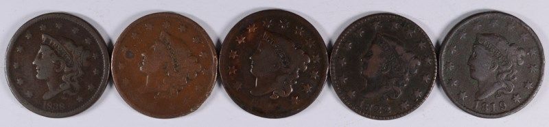 LOT of (5 ) LARGE CENTS, 1819, 1822, 1827, 1837, 1838, VARIOUS GRADES