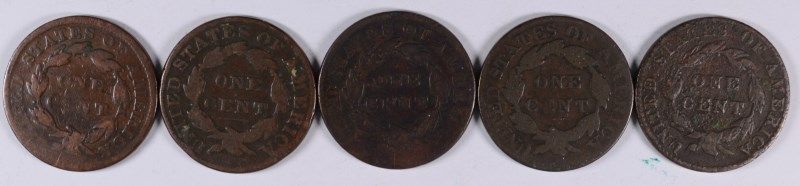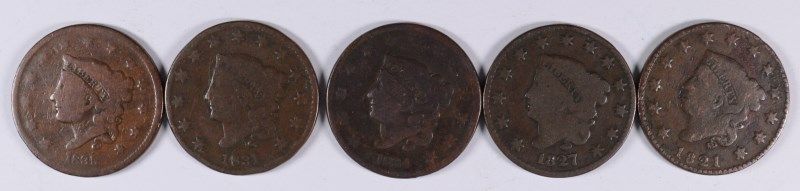 LOT of (5) LARGE CENTS, 1821, 1827, 1831, 1834, 1835, VARIOUS GRADES