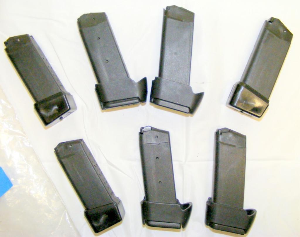 Seven Glock factory magazines. Three 9rd mags with 2-shot extension for the Glock 27 and four 13rd mags with magazine spacer that allows to be used with Glock 27. Remove spacer and mags will fit in Glock 23. Above average shape.