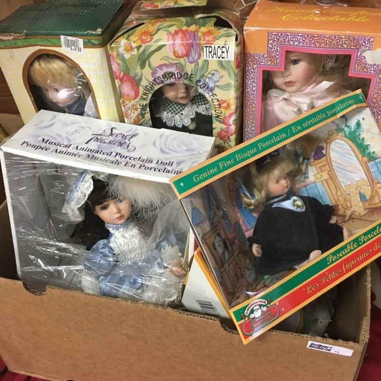 Box Lot: Porcelain Dolls (6) & Doll Holders