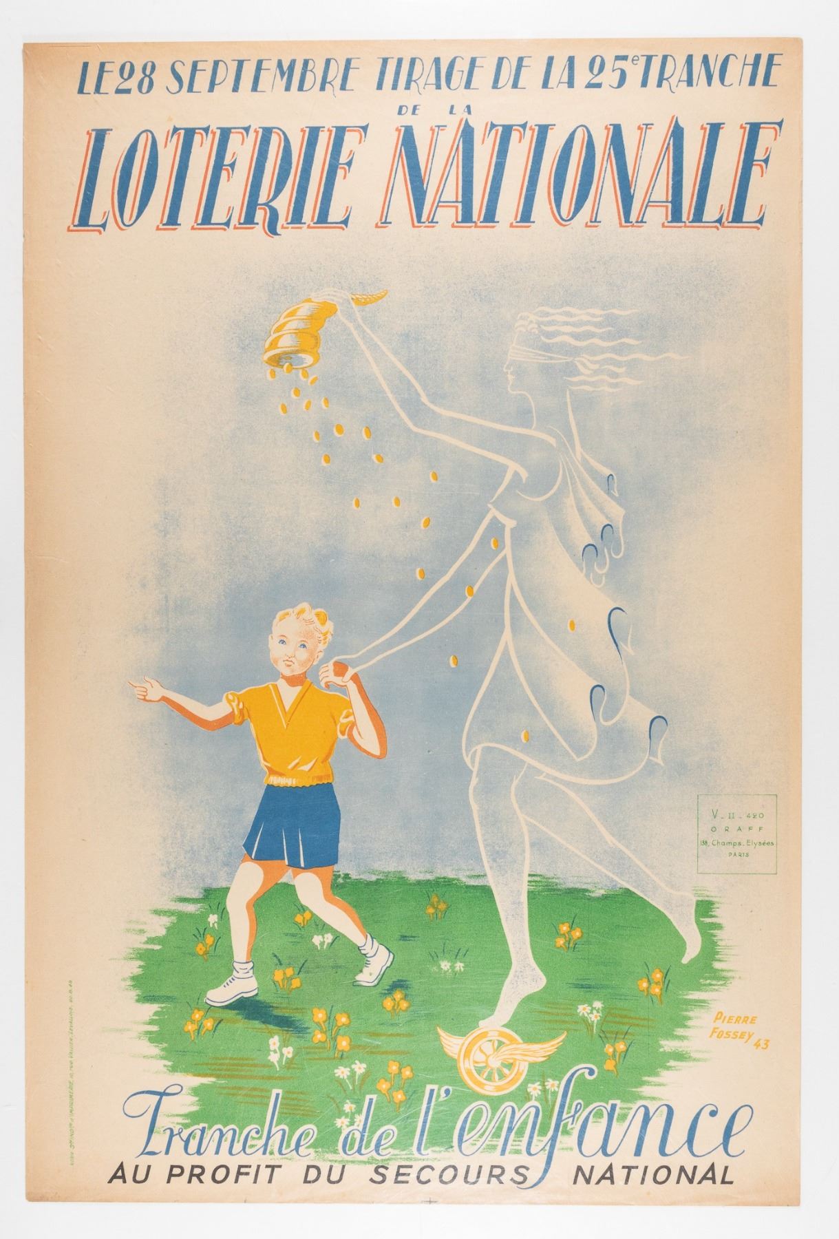 Loterie Nationale - for the benefit of national relief', artwork by Pierre Fossey, (1901-1976), 1943, 23 x 15 inches. Minor tears.