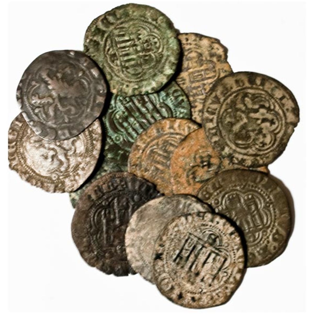 Conjunto de 13 monedas medievales de Enrique IV, exceptuando 2 cuartos de Felipe III, con cecas de Sevilla, Toledo, Cuenca y Burgos. A EXAMINAR. BC+.