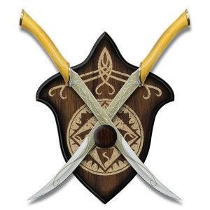 United Cutlery, industry leader in fine movie reproductions, has meticulously recreated these breathtaking props using only the finest grade materials and craftsmanship. Attention to detail was a top priority to ensure these blades match the actual filming prop as closely as possible. These officially licensed replicas from The Lord Of The Rings Trilogy bring to life the fighting knives wielded by Legolas Greenleaf. In the series, Legolas wields these twin fighting knives with incredible speed and savagery. Features Razor-sharp stainless steel blades Handcrafted solid wood handles Solid metal guard and pommel Elven vine decorative accents Certificate of Authenticity Includes display plaque Blade Length: 15 inch Overall Length: 22 3/8 inch Vendor Part #: UC1372 Weight: 6.30