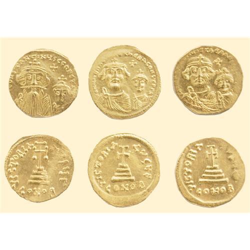 Lot of 3 Byzantine gold solidi, all from Constantinople, including 2 of Heraclius showing the emperor and Heraclius Constantine, and 1 of Constans II with busts of Constans II and Constantine IV.