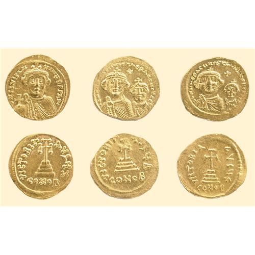 Lot of 3 Byzantine gold solidi, all from Constantinople, including 2 of Heraclius showing the emperor and Heraclius Constantine, and 1 of Constans II with facing bust of the emperor.