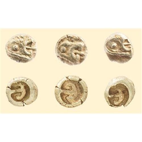 Lot of 3 electrum 1/12th Staters(?) of an uncertain mint in Asia Minor, c. 600-500 B.C. Each with obverse stylized design, perhaps representing a lion`s head with protruding tongue, reverse single divided punch with volute design. Weidauer-. Rosen-. Boston-.