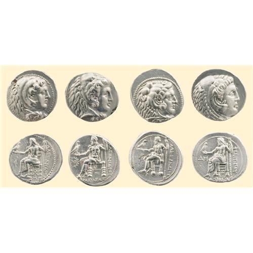 Lot of 4 silver tetradrachms of Alexander the Great and Philip III. All with Herakles / Zeus enthroned types, including 3 Alexanders and 1 Philip. The Alexanders include a specimen from Ake (probably Price 3265), 2 from Babylon (Price 3747), the Philip is from Aradus (Price P144).