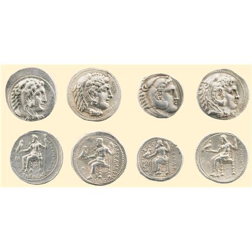 Lot of 4 silver tetradrachms of Alexander the Great and Philip III. All with Herakles / Zeus enthroned types, including 3 Alexanders and 1 Philip. The Alexanders include a specimen from Babylon (Price 3692) and two others, the Philip is from Babylon (Price P186).