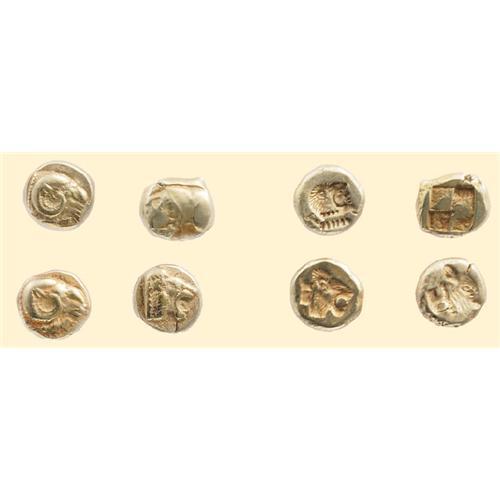 Lot of 4 electrum hektes of Asia Minor, principally of c. 521-478 B.C. Includes 3 from Mytilene on the Island of Lesbos (ram`s head right, cock below/Heracles head right, incuse, Bodenstedt My 18; ram`s head right, cock below /lion`s head right, incuse, Bodenstedt My 16; lion`s head right / calf`s head right, incuse, Bodenstedt My 13; and one from Phokaia in Ionia, obverse type degraded, reverse quadripartite incuse square.