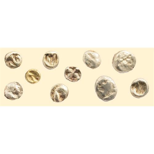 Lot of 9 early electrum coins and 1 early gold coin of Asia Minor, all c. 600-500 B.C. The denominations range from 1/48th Staters to 1/12th Staters, with most being 1/24th Staters. The designs are schematic, and not all are identifiable, the reverses feature incuse punches. Total of 10 coins.
