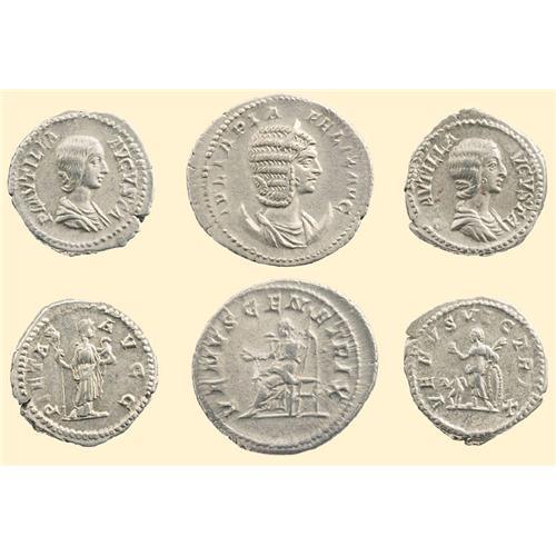 Lot of 3 Roman Imperial silver coins featuring third century empresses, including an antoninianus of Julia Domna with VENVS GENETRIX reverse and 2 denarii of Plautilla, one with PIETAS AVG reverse, the other with VENVS VICTRIX reverse.