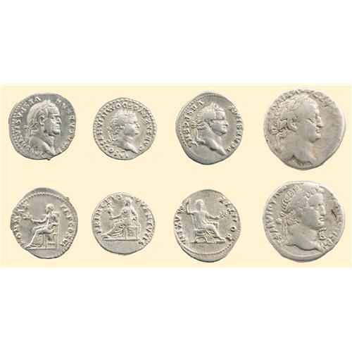 Lot of 4 Roman Imperial silver coins of the Flavians, including 1 denarius of Vespasian, 1 denarius of Titus, 1 denarius of Domitian with PRINCEPS IVVENTVTIS reverse, as well as a silver tetradrachm of Antioch with portraits of Vespasian and Titus dated year 2 (69/70 AD).