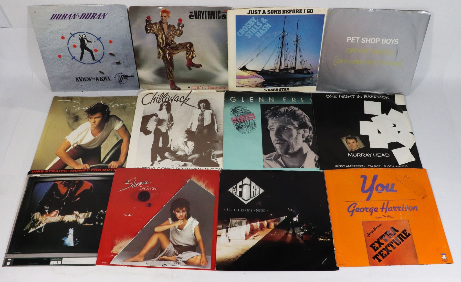 LOT OF 12 - 7" 45RPM SINGLES WITH PICTURE SLEEVES INCLUDING PET SHOP BOYS, DIRE STRAITS, SHEENA EASTON, THE FIRM, DURAN DURAN, EUYTHMICS, CROSBY STILLS & NASH, GEORGE HARRISON ETC.