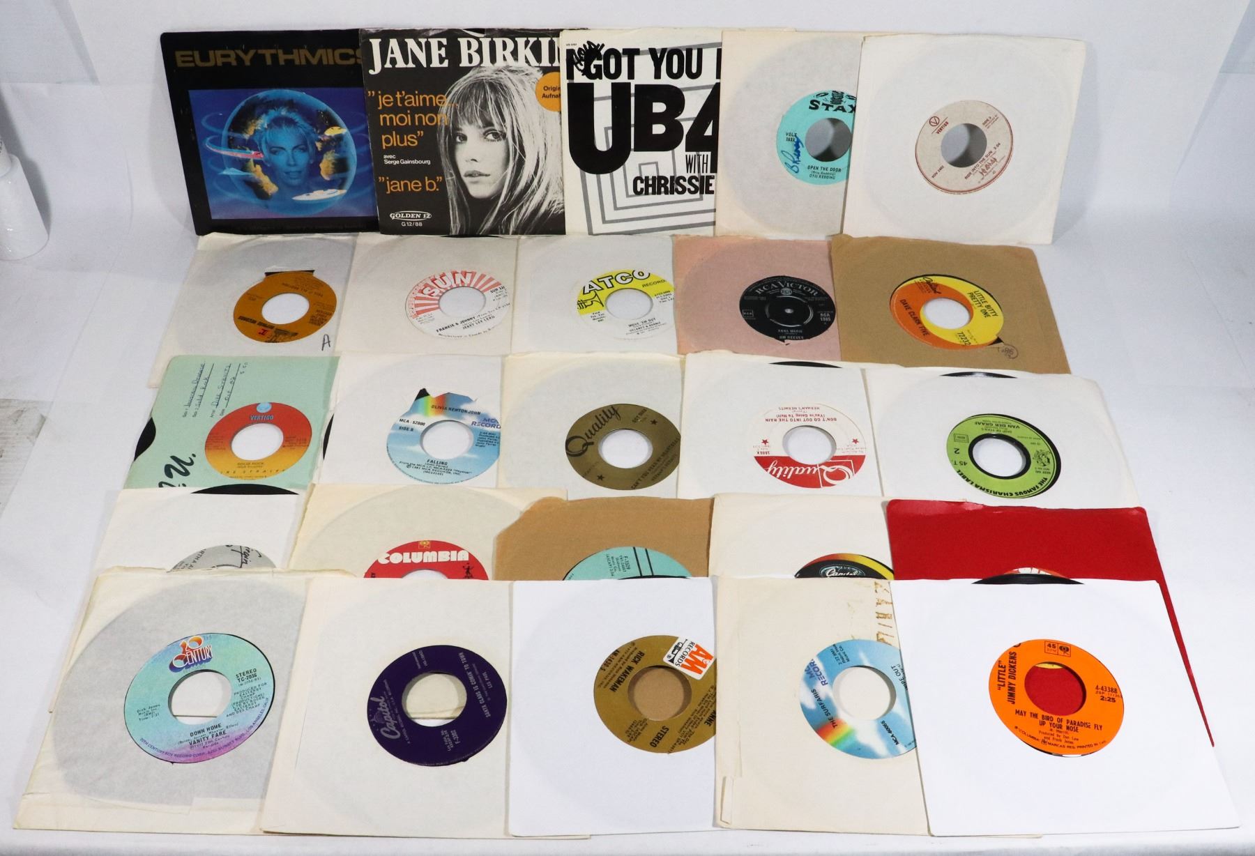 LOT OF 25 - 7" 45RPM SINGLES WITH PLAIN & SOME PICTURE SLEEVES INCLUDING OTIS REDDING, DEF LEPPARD, KENNY ROGERS, DAVE CLARK FIVE, HERMANS HERMITS, VAN DER GRAAF, DURAN DURAN, PAUL MCCARTNEY, VANITY FARE ETC.