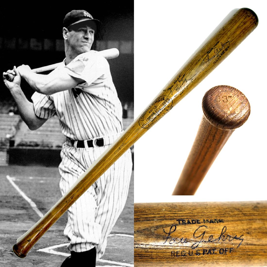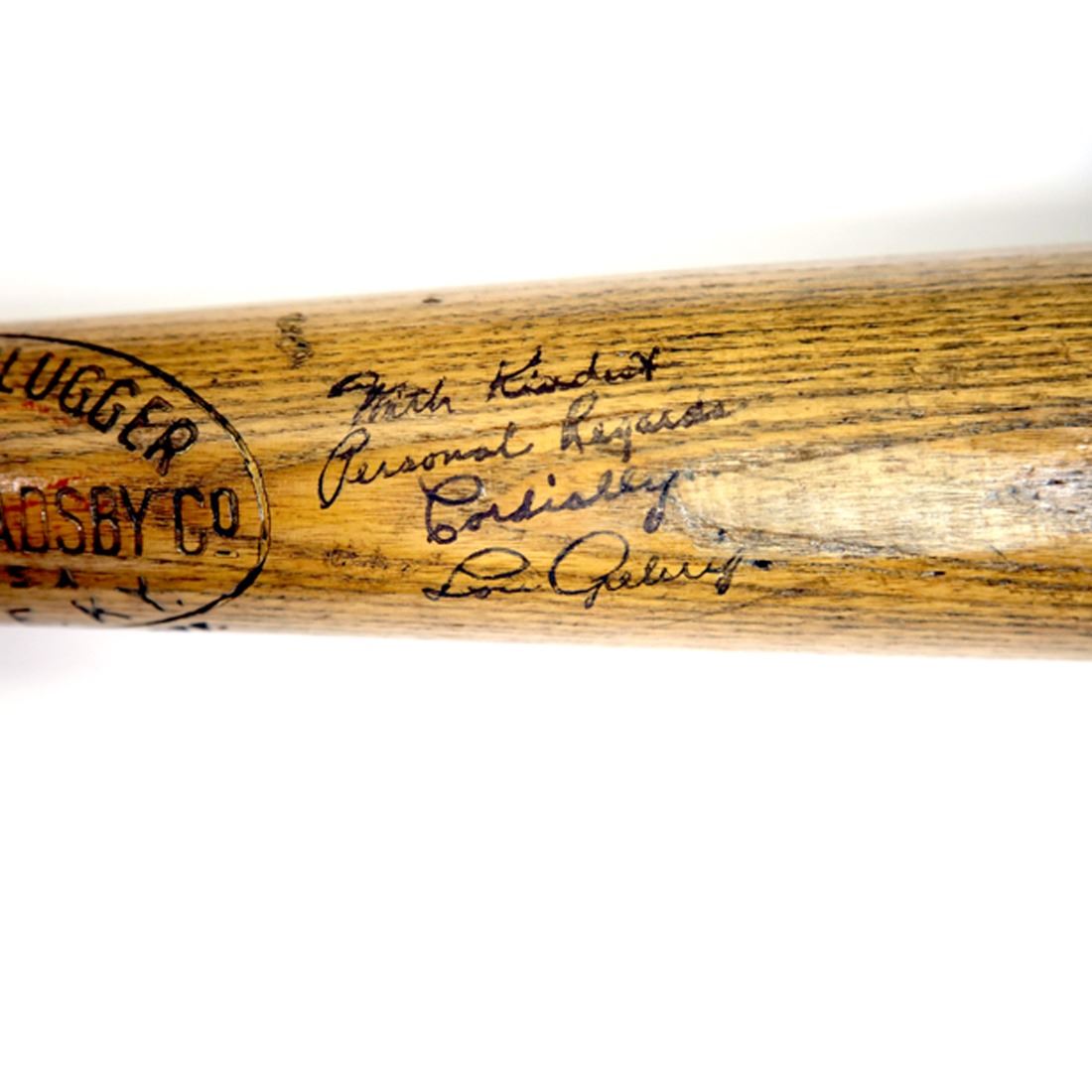 Lou Gehrig signed Vintage 1933/34 40-LG Louisville Slugger Hillerich & Bradsby 33" Store Model Baseball Bat. Labeling suggests manufacture in 1934. Gehrig's black fountain pen ink appears just below the center trademark of the signature model Hillerich & Bradsby 40 L.G. retail bat. The bat measures thirty-three inches in length, as confirmed by stamping on the knob reporting this dimension and exhibits moderate to significant wear. The Lou Gehrig signature comes with the inscription, 'With Kindest Personal Regards Cordially." This item comes with a letter of authenticity issued by Guaranteed Forensic Authenticators along with the GFA guarantee of authenticity.