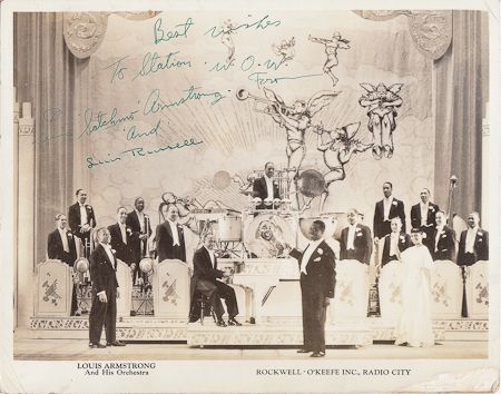 (August 4, 1901 – July 6, 1971), nicknamed Satchmo or Pops, was an American jazz trumpeter and singer from New Orleans, Louisiana. I.S.P., 8"x10", n.d., "Louis Armstrong and his Orchestra Rockwell-O'Keefe Inc., Radio City" (New York), imprint on verso "Louis Armstrong Joe Glaser Personal MGR." Signed "Best wishes To Station W.O.W. From Louis "Satchmo" Armstrong and Louis Russell". Louis Russell, seated at the piano, was a jazz pianist and bandleader. Armstrong stands at the center right holding a trumpet. The inscription and signatures, being to a radio station, are in bold green ink. Light edge wear to photograph, else fine. Suitable for framing.