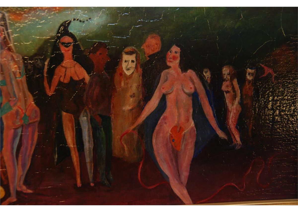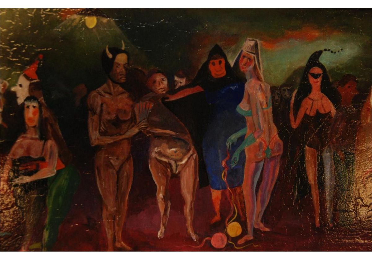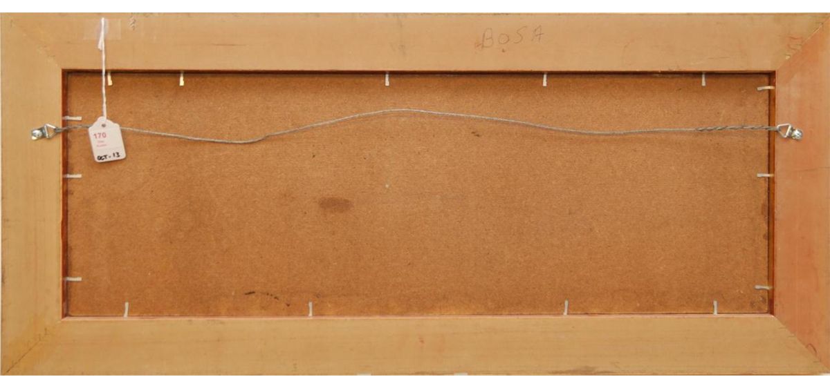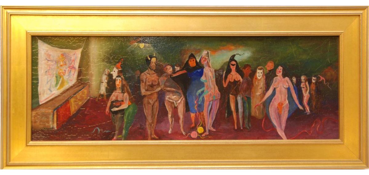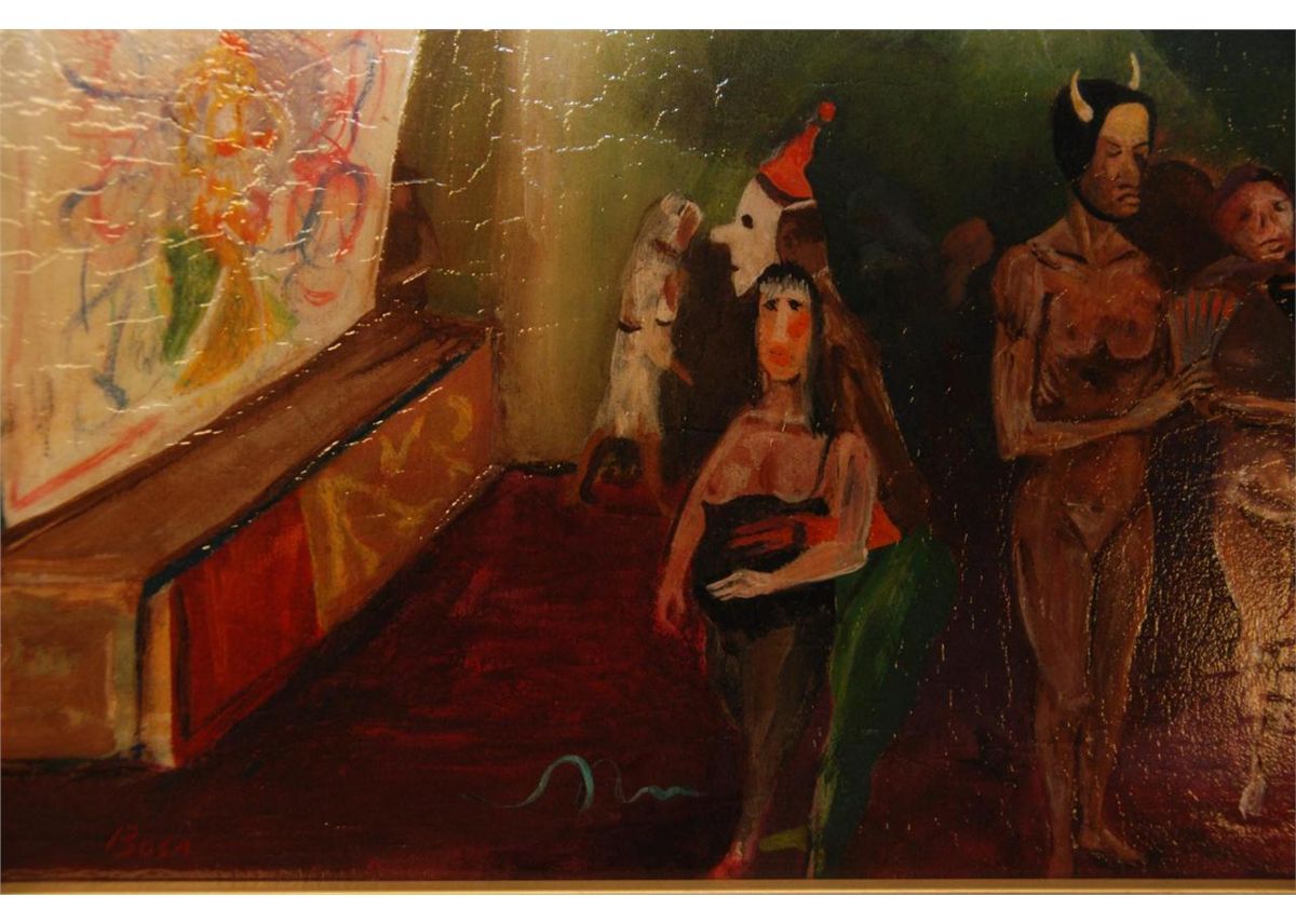 Louis Bosa (ITALIAN, 1905-1981) oil painting on masonite depicting a costume party scene. Signed lower right. Mounted in gold painted frame. Measures 9" height x 26 1/4" width + 2 1/4" mat & frame (22.8cm x 66.6cm + 5.7cm).