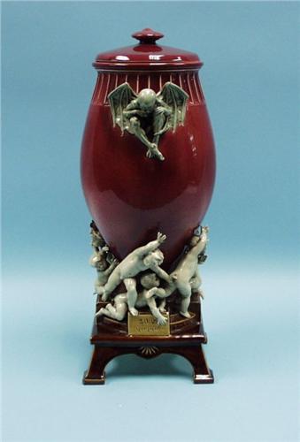LOUIS CARRIER BELLEUSE - "SAUVE QUI PEUT". An important antique Choisy-le-Roi-Majolica covered urn. The oviform vessel with rose ground supported on a base mounted with white putti in distress, surounding the title plaques. Pair of applied handles in form of gnomes with bat's wings. Hallmarked and signed. 20" high. Circa 1880. Louis Carrier Belleuse was a frequent exhibitor at the Paris Salons, his ceramic work for the Choisy-le-Roi and Sevres Factory as well as for A. Rodin is of a particular importance.