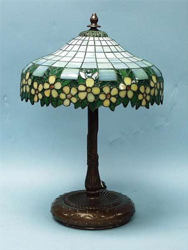LOUIS COMFORT TIFFANY - A good signed bronze lamp base with an American period leaded glass shade. Base with impressed signature and number. 12000-15000