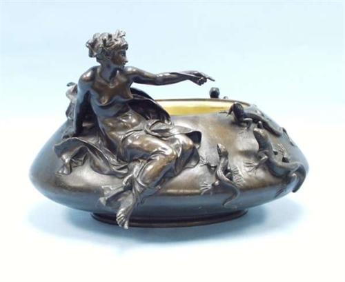 LOUIS-ERNEST BARRIAS (1841-1905) - A bronze figural centrepiece sculpted in the form of a nude beauty sitting on a bowl, the perimeter relief decorated with lizards. Excellent patina. With Barbedienne foundry mark. Signed. Ref. Benezit, vol. 1, page 420. 6000-7000