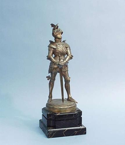 LOUIS GOSSIN (1855-1905) French school. Silver patinated bronze figure of a standing knight in full armour. Finely carved ivory face. Signed and with Societe des Bronzes, Paris marking on circular base. Raised on black marble plinth. 22" high. Illustrated in Abage: "Encyclopedia of Bronzes", volume 2, page 399, photo 1492. Reference: Benezit, volume 4, page 357. 5000-6000