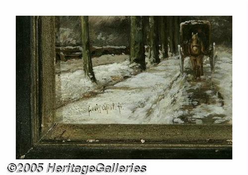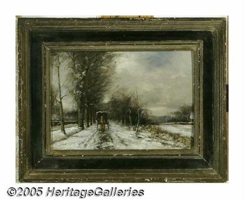 <B>LOUIS (LODEWYCK FRANCISCUS HENDRIK) APOL (Dutch 1850-1936)</B></I><BR>Carriage Approaching in Winter<BR>Oil on panel<BR>9in. x 13in.<BR>Signed lower left<BR>Provenance:Frans Heerkens Thussen Schilderijen-Antiquiteiten Haarlem<BR><BR>Condition Report: Some minor cracklure in sky, frame abrasion on left and right edges with tiny (<1mm) areas of paint loss center right and left, some warping of panel in top left corner, minor inpainting on top, left and right edges<BR>