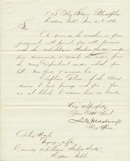 (1805 - 1877) Union admiral who commanded the North Atlantic Blockading Squadron and planned the naval aspects of Burnside's Roanoke expedition. War-date L.S., 1p. 4to., Hatteras Inlet, Jan. 21, 1862, to Acting Master Gregory of the USS "Western World". In part: "...As soon as the weather, in your judgment, will permit, you will proceed with the U.S. Steamer 'Western World' under your command & execute the orders from the Navy Department under which you left New York & arrived here...". Fine condition.