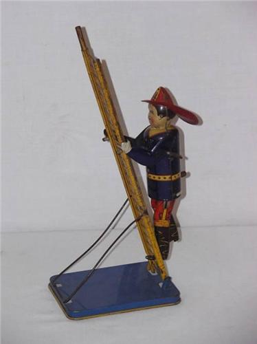 LOUIS MARX TIN LITHOED CLIMBING FIREMAN WIND-UP TOY - MISSING TOP SECTION OF LADDER;
