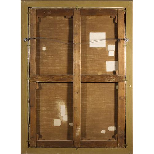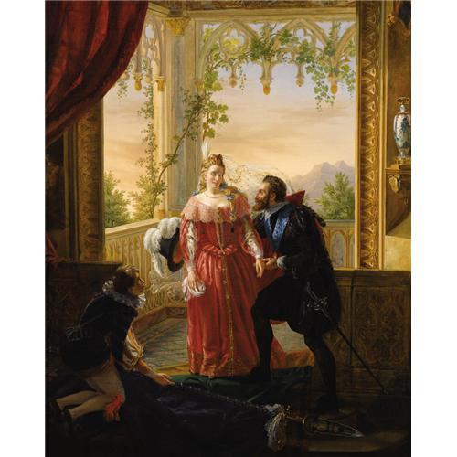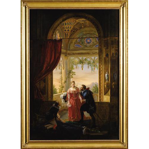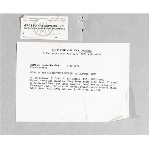 <B>LOUIS-NICOLAS LEMASLE</B></I> (French 1788-1870)<BR><I>Henri IV And His Mistress,</B></I> 1826<BR>Oil on canvas<BR>61-3/4 x 42-1/4 (157 x 107.3 cm)<BR>Signed, dated and inscribed: <I>Henri IV avec / Sa Maitiesse / Peint par Louis Lemasle / chevalier de la Legion / d'honneur / 1826</B></I><BR>On verso is a canvas maker's stamp from France<BR><BR>Provenance:<BR>Castle Hotel (Velden, Carinthia);<BR>Sale, the Art Trade (Vienna, Austria);<BR>Shephard Gallery (Robert Kashey, New York)(by 1993, aqcuired at the above sale)<BR><BR>Exhibition:<BR>Shepard Gallery (New York), Fall 1993, <I>From Isabey to Noguchi: Paintings, Drawings, Sculpture,</B></I> cat. No. 9, (color illustration) <BR><BR>Literature:<BR><BR>Catalgue, <I>From Isabey to Noguchi: Paintings, Drawings, Sculpture</B></I>; Shepard Gallery, New York, NY, Fall 1993 (No. 9, color illustration);<BR>Hans Naef, <I>Kie Bildniszcichnugnen von J.-A.-D. Ingres,</B></I> Bern 1977, vol. 1, pp. 268-272<BR><BR>The offered painting depicts one of six scenes from the life of Herny IV (1533-1610), all executed by Lemasle during a revivalist period known as <I>style Troubadour.</B></I> This particular work depicts an event from 1587 when Henry IV was in need of additional troops, which Countess de Gramont funded. Henry IV's subsequent triumph assisted him in securing the crown and thus after the battle of Coutras he laid the captured flags at the feet of his mistress.<BR><BR>Lemasle studied under David at the <I>Ecole des Beaux-Arts</B></I> before traveling to Rome where he had his portrait drawn by Ingres in 1812. He was fortunate enough to become enlisted in service to the Prince of Salerno in Naples. The prince's patronage would provide Lemasle with security and opportunity for years to come in the form of the prince's sister, the Duchess de Berry. <B>Condition Report:</B> Unlined, original linen canvas, painting intact, rich colors, excellent surface, support has been reinforced presumably to consolidate loose paint, no sign of cleavage, eleven small patches to the reverse (please review online image of verso) with scattered inpainting corresponding to patch reinforcements, frame is not period<BR><BR><b>Shipping:</b> Requires 3rd Party Shipping (<a target="_blank" href="http://www.heritageauctions.com/common/shipping.php">view shipping information</a>)