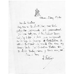 <b>399. LOUIS PASTEUR </b>(1822 - 1895) French chemist and biologist who developed antibodies for rabies and anthrax and disproved theories of spontaneous generation. A.L.S. <i>"L. Pasteur</i>" on his monogrammed letterhead, 1p. sm. 8vo., Villeneuve-L'etang, July 15 [n.y., ca. 1885], in French to his successor, Emil Duclaux. In part: "<i>...Have you seen M. Liard? Did you decide anything either together or separately? I have arranged an engagement with M. Bribeau tomorrow...Would you be able to come with me [to see Liard]?...</i>". Light toning, else very good.<b>$1,000-1,500</b>
