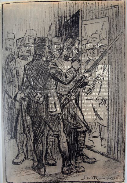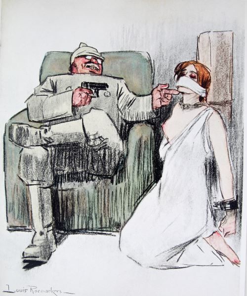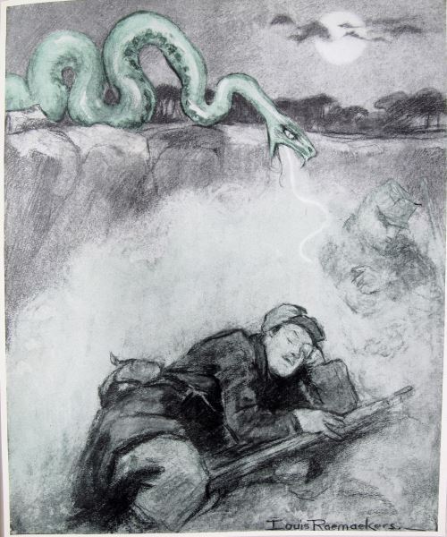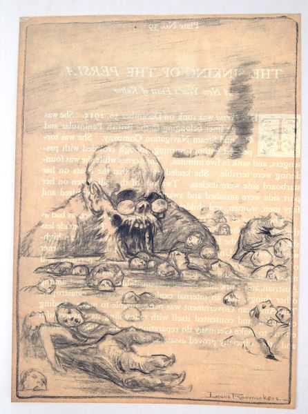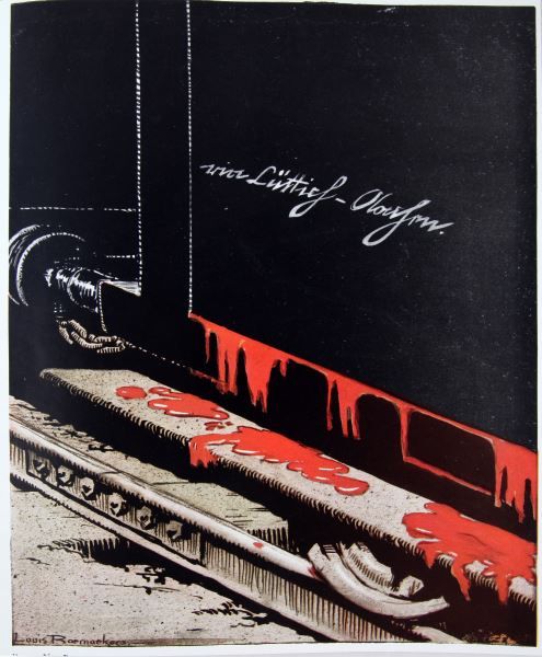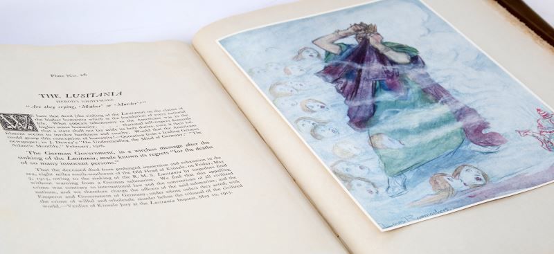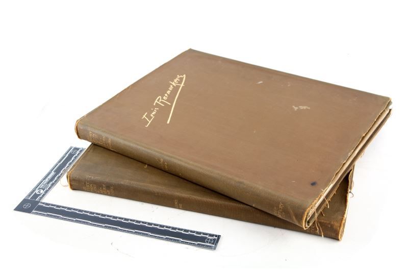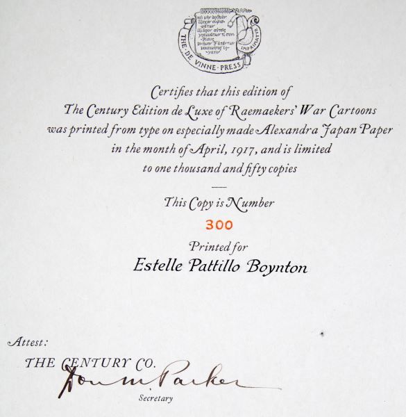 Louis Raemaeker (Dutch, 1869-1956) two large format (15.5 by 18 inches) volume “The Century Edition de Luxe of Raemaekers War Cartoon” 1917 named and numbered edition 300/1050 printed for “Estelle Pattillo Boynton” and signed by the secretary of the Century Co. Forward by Theodore Roosevelt, Introduction by H. Perry Robinson. 125 tipped-in color-plates with descriptions on facing pages. Cartoons range from satirical humor to somber and emotive. Book, dust jacket (some edge fraying), binding, and pages are in very good condition for their age, some shelf wear. Several plates have discoloration from the text on the facing pages. Overall in very good condition.