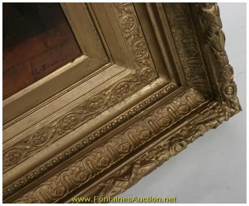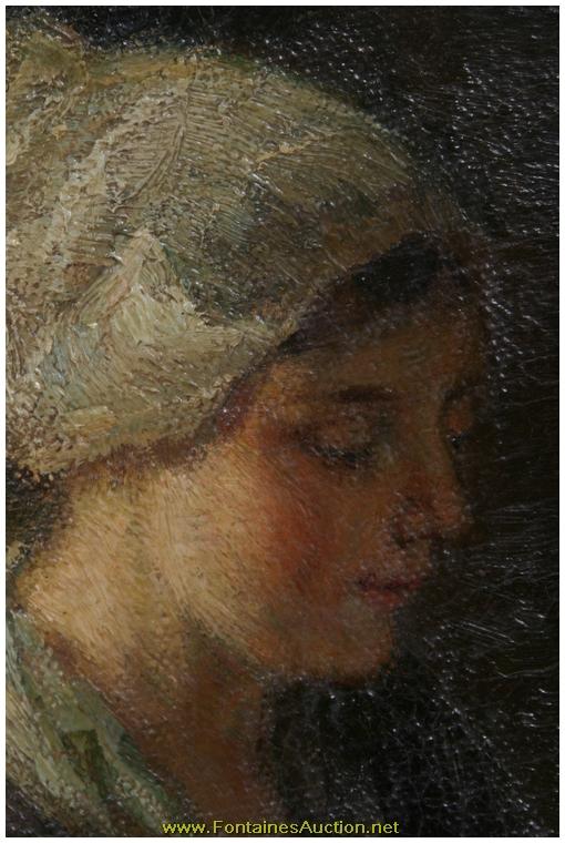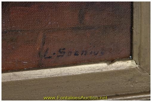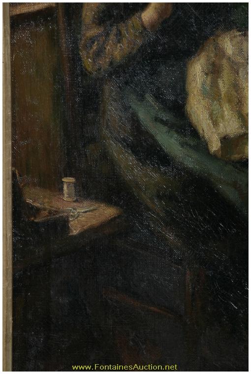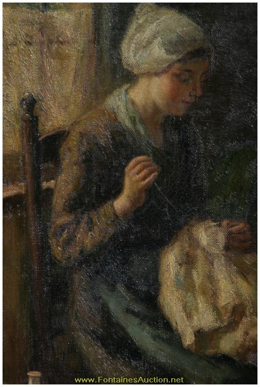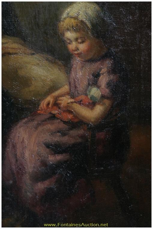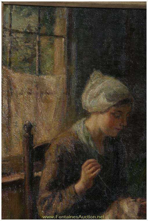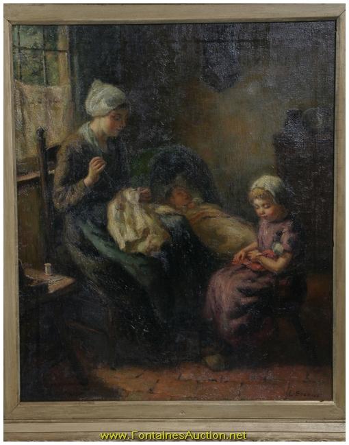Louis Soonius O/C Mother & Children (1883-1956). Large oil on canvas, scene of a woman seated by a window while she sews, she is dressed in a long dress with a bonnet on her head; seated facing her is a young girl holding a small doll, in between is a baby rocking in a cradle. Signed lower right, L. Soonius, in excellent condtion. 19"W x 23"H. Estimated Value$1,000 - 1,500.