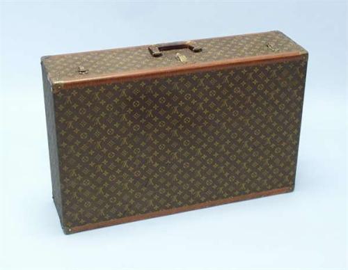 LOUIS VUITON - A 1940's French wooden railway trunk covered in traditional Vuitton patterned brown leather. 31 1/2" x 20" x 8 1/2". Hallmarked. 1300-1600