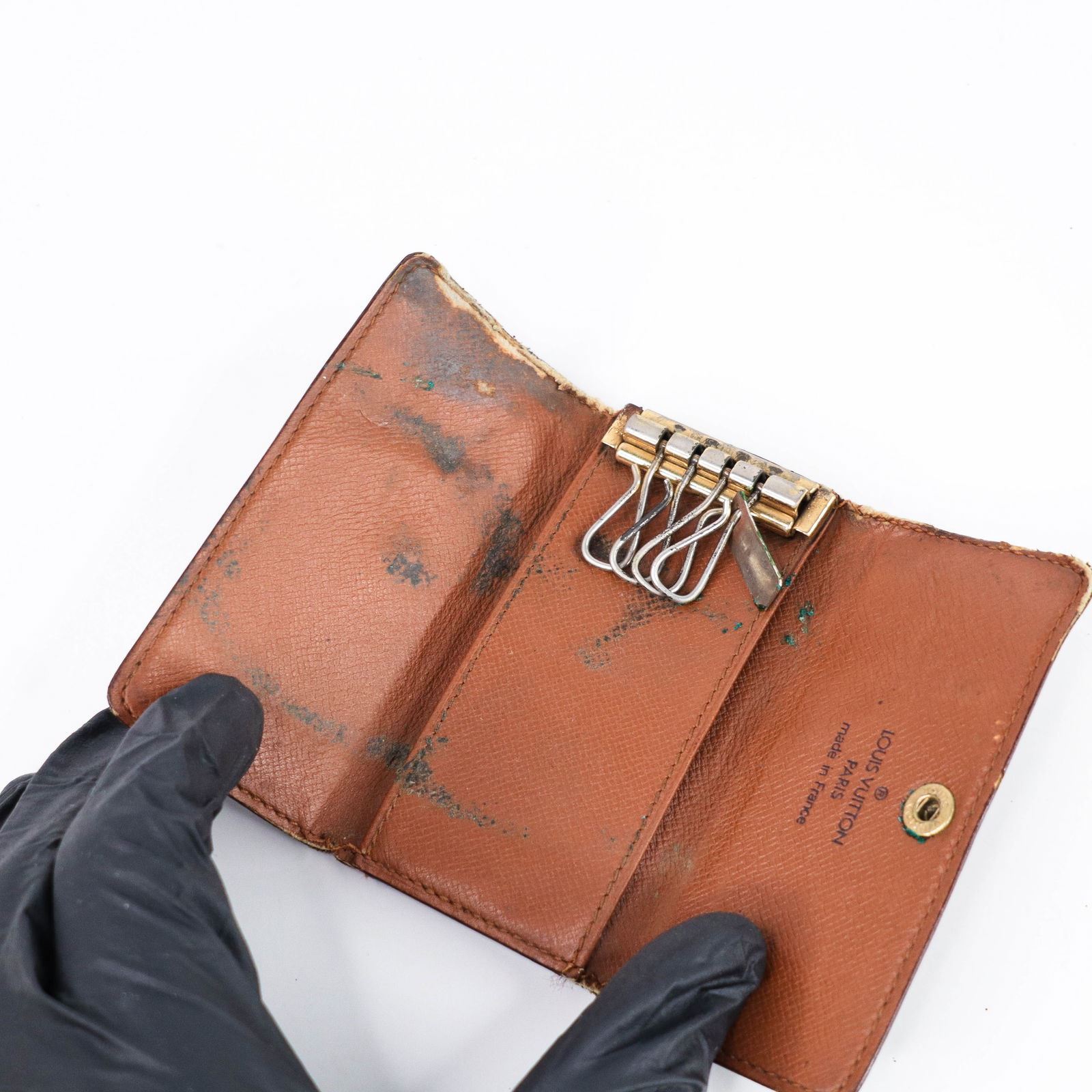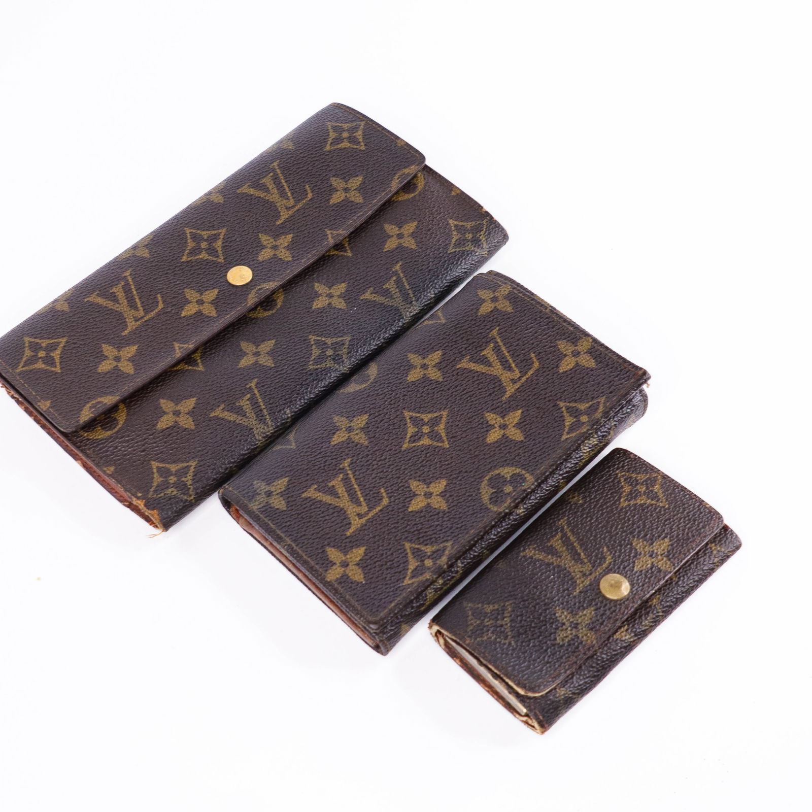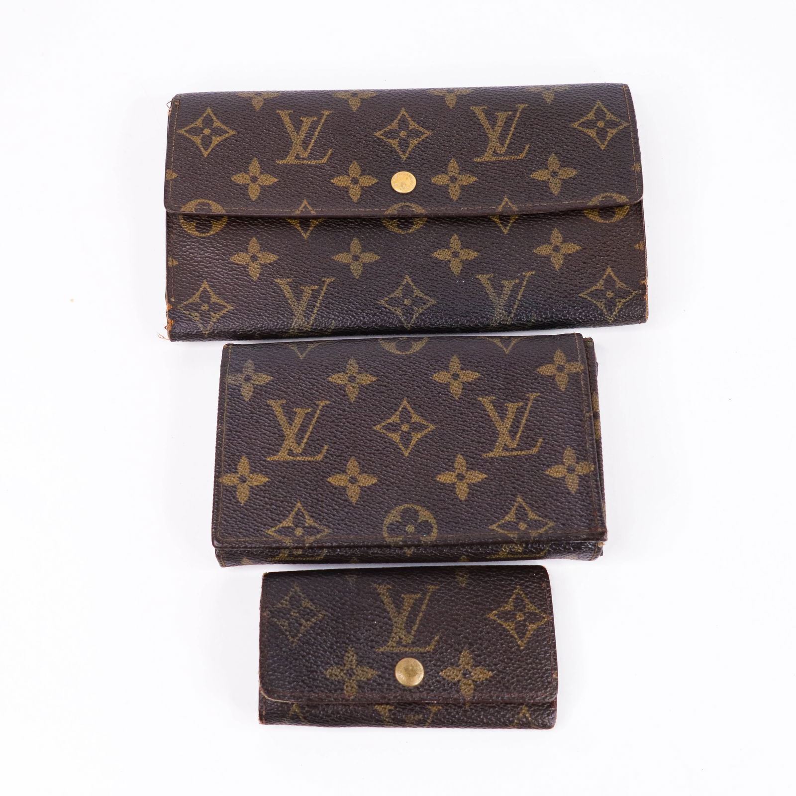 Brand: LOUIS VUITTON Style: Keyring/Wallet set Pattern: Monogram Set Includes: 3 items (keyring and wallets) Condition: F Rank – Significant wear, including large scuffs, corner wear, metal scratches, and interior stains Notes: Includes a bifold wallet with a stuck coin purse zipper; ideal for repurposing or fixer-upper projects Accessories: None