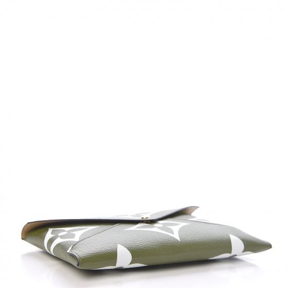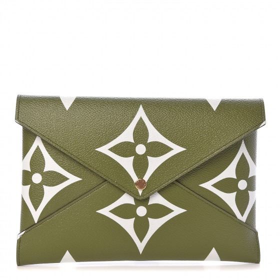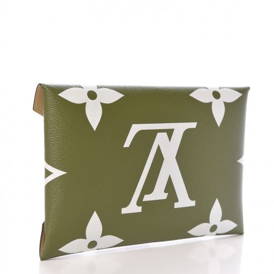 LOUIS VUITTON Monogram Giant Kirigami Pochette Set from the Summer 2019 collection pouches are ideal for carrying money, credit cards or passports. This special edition of the Pochette Kirigami plays with different sizes of Monogram canvas in a fresh color combination of khaki, white and beige. The front flap opens to a spacious beige interior.