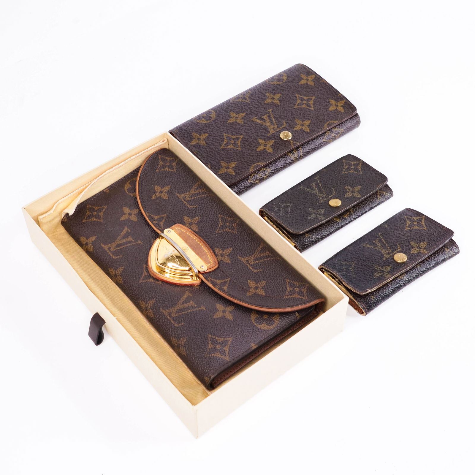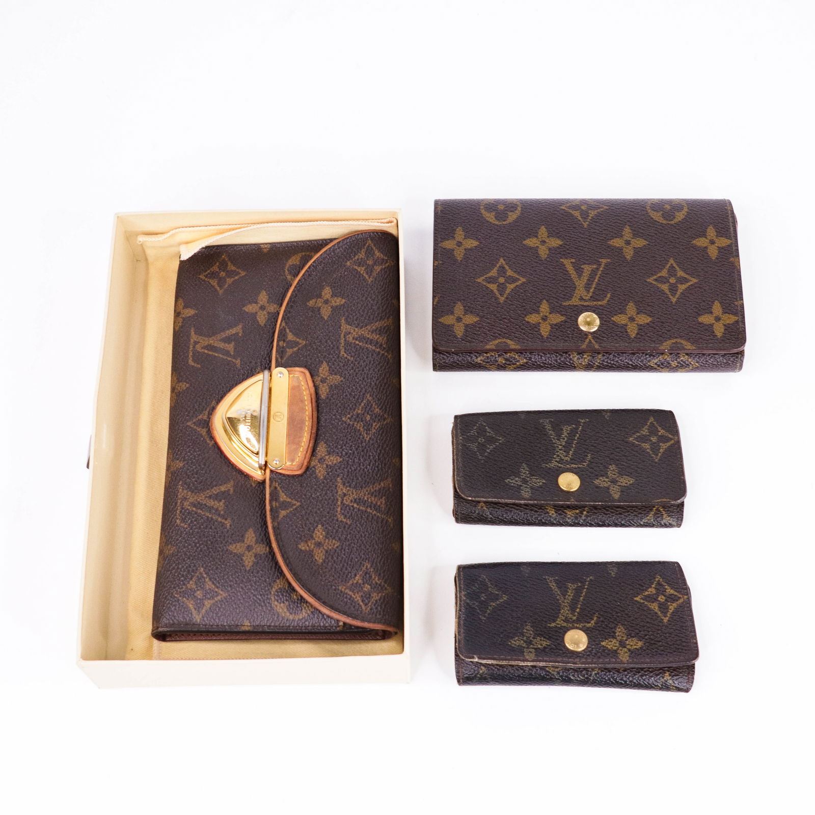 Brand: LOUIS VUITTON Style: Wallets and key cases Models Included: Portefeuille Eugénie and other Monogram pieces Material: Monogram canvas and leather Set Includes: 4 items (assorted wallets and key holders) Condition: F Rank – Grouped due to significant overall wear Notes: Ideal for repurposing, restoration, or fixer-upper projects Accessories: Box and dust bag