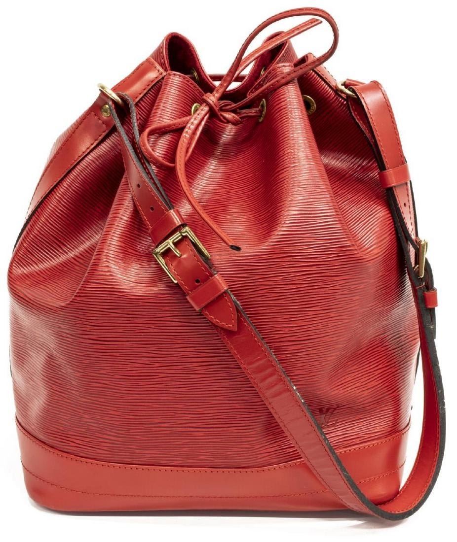 Louis Vuitton "Noe GM" bucket bag, in red Epi leather, with brass hardware, adjustable flat shoulder strap, drawstring closure at front face opening to red Alcantara lined open interior, creasing, slight patination, slight spotting to drawstring, bag: measurements for shipping purposes only - approx: 13.25 "h, 16 "w, 7.5 "d,
