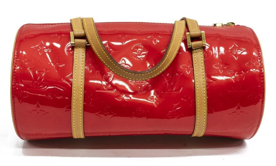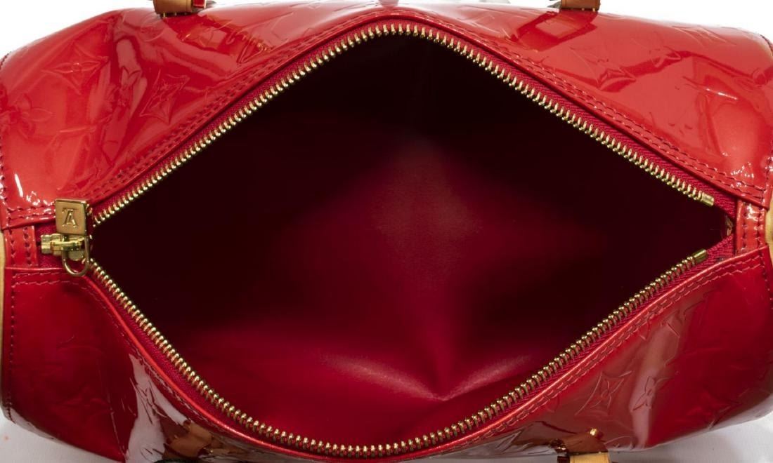 Louis Vuitton "Bedford" handbag, in red monogram Vernis leather, with brass hardware, tan vachetta leather trim, dual flat handles, exterior slip pocket at side, zip closure at top opening to tonal leather lined interior, patination, creasing, slight scuffing to exterior, bag: measurements for shipping purposes only - approx: 6" h, 12" w, 6 "d,