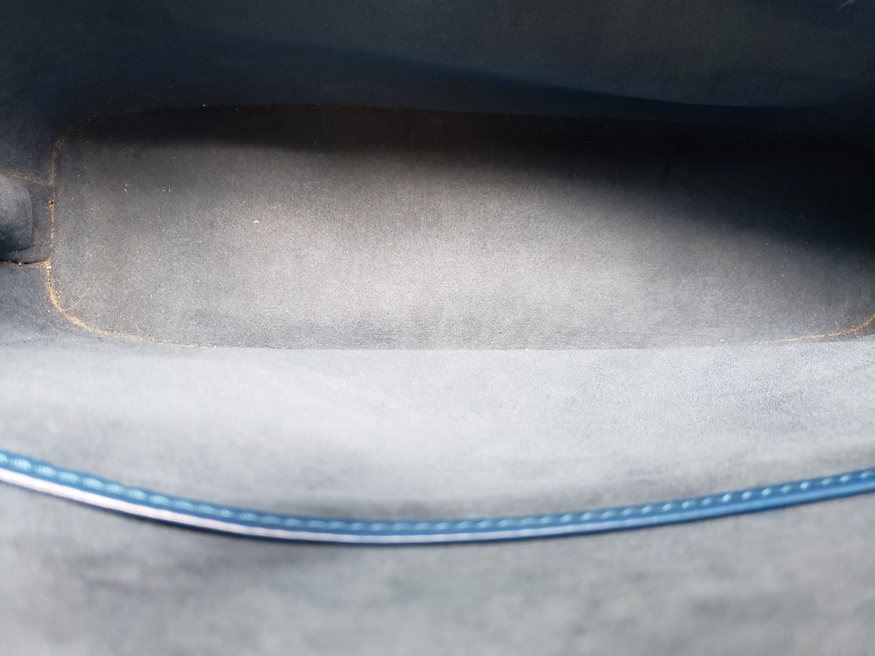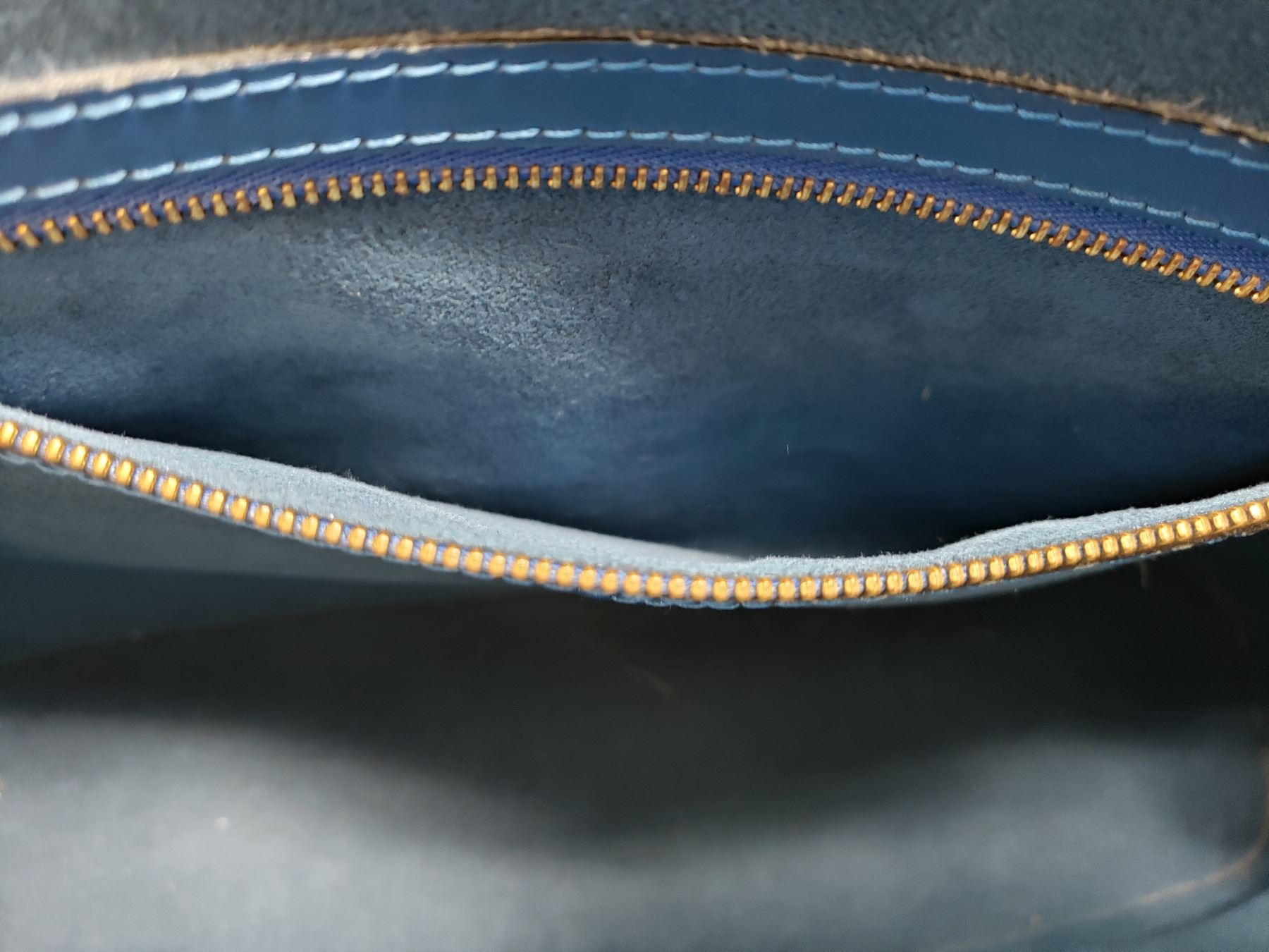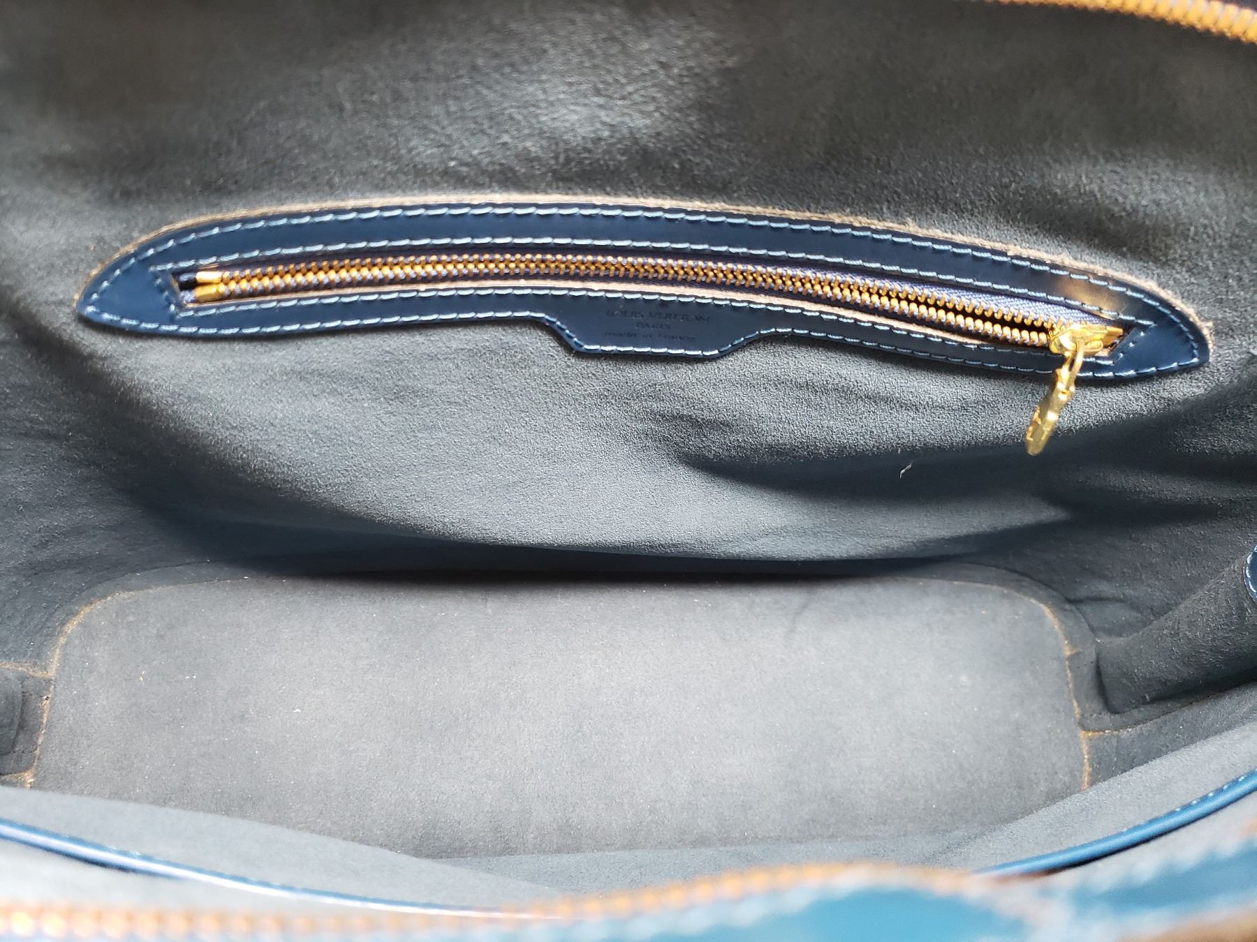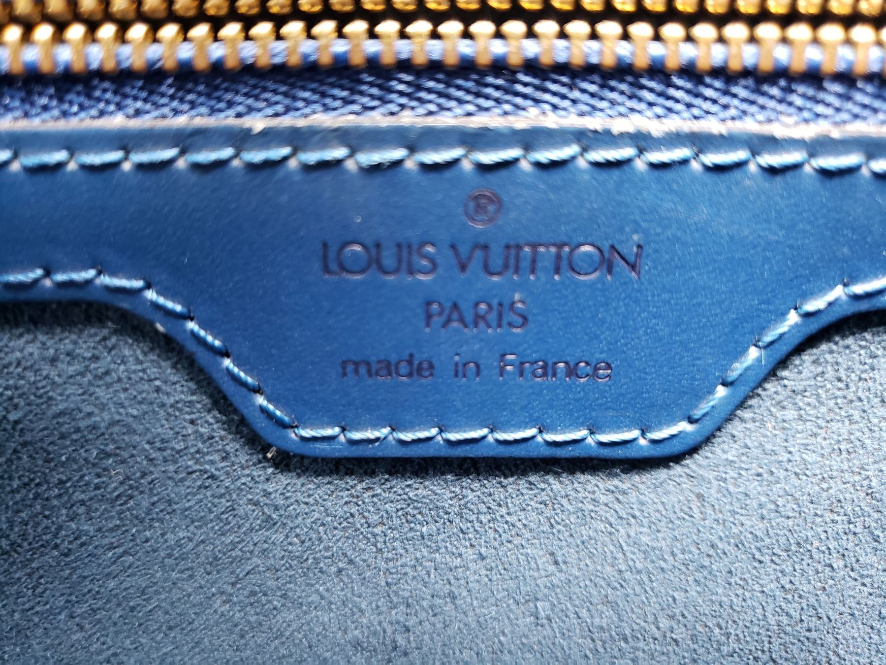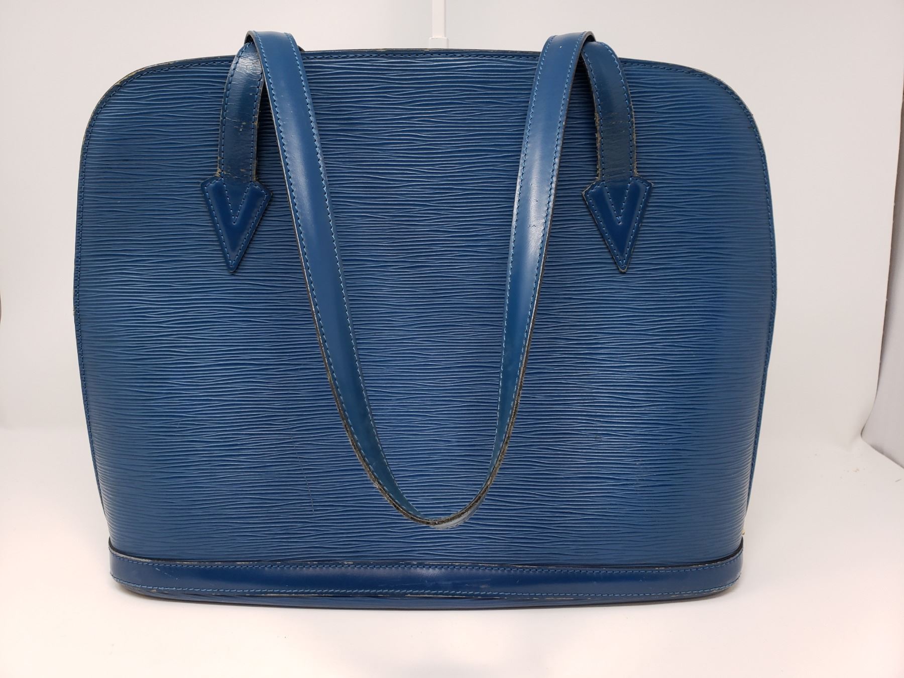 Blue Epi leather Louis Vuitton Lussac tote with brass hardware, dual flat shoulder straps, embossed monogram at front corner, tonal Alcantara lining, dual pockets at interior walls; one with zip closure and two-way zip closure at top.