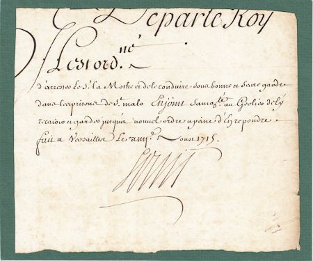 (1638 - 1715) "The Sun King", King of France who undertook a series of wars with neighboring countries, yet is most remembered for impoverishing of the masses as he reigned at the height of France's "Golden Age". Partial manuscript D.S. 1p. 8vo., 1715, the conclusion of a document - likely an appointment or other state matter. Bold signature, mounted to stiff sheet, light foxing, very good.