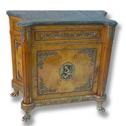 Absolutely GORGEOUS is an undertatement when trying to describe this unique piece. Exquisitely crafted of rare bird's eye maple and highlighted by stunning solid brass Ormolu trim in the manner of the Louis XV Regence period, it is crowned with a massive slab of solid Verde marble measuring almost 1 3/4" thick! The perfect addition to your parlour, foyer, hallway, master suite, bath, or dining room, the incredible beauty of this piece is only rivaled by its equally incredible versatility. This magnificent piece would also lend itself quite nicely for use as a liquor cabinet, the perfect venue to store your prized selection of fine spirits behind its locking door. No matter where you choose to place it, this fabulous piece is guaranteed to be an "eye-catcher" and a powerful focal point. A museum quality piece such as this will become a cherished family heirloom to be enjoyed by many generations to come.