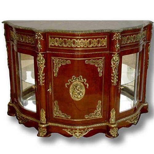 This fabulous Bahut/Vitrine (Curio Cabinet) is a stunning example of the art of the cabinetmakers who practiced their art during the Regence Period of King Louis XV of France. This magnificent piece is beautifully executed in solid Kingswood and mahogany in a classical demi-lune design with two locking glass doors and a third locking door which opens to a spacious compartment for additional storage. This exciting piece is crowned with a massive slab of solid polished Verde marble measuring almost 1 3/4" thick and featuring a traditional edge design. It is accented by rich solid brass Ormolu trim while its spacious interior with glass shelves on either side and a mirrored back is patiently awaiting the opportunity to display YOUR most valuable collectibles. The exquisite beauty of this classic piece is only rivaled by its incredible versatility. Wherever you choose to place it; in a foyer, hallway, dining room, parlour, library or private den, it is certain to make an elegant statement and be admired by all who lay their eyes upon it. Advid collectors will know that pieces of this size, quality, and design seldom find their way to the marketplace and are usually priced substantially higher when they do. This is a rare chance to own a piece of Louis XV Regence furniture that will surely become a cherished family possession to be enjoyed for generations to come.