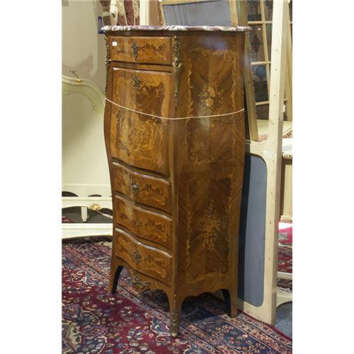SECRETAIRE ABATTANT: Louis XV style bombe Secretaire a Abattant, ormolu mounts, marquetry inlay, fitted interior with gilt tooled leather writing surface, marble top. 52''h x 13''d x 23''w