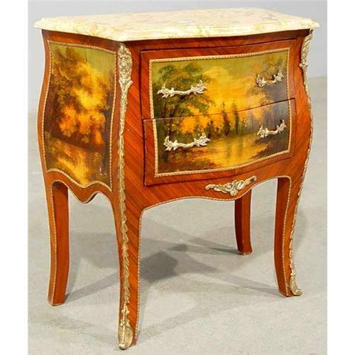 This exquisite example of the cabinetmakers' art as practiced during the reign of King Louis XV of France is not just a fabulous piece of furniture but a work of art as well. Executed of gorgeous walnut in a classic chevron pattern, by far the most breath-taking feature of this piece are the magnificent hand painted Vernis Martin panels on the front and sides depicting a relaxing riverscape. Crowned with a creamy smooth marble top with accented with rich brass Ormolu trim, this incredible piece would look stunning in your master suite as a night stand or in the parlour or den next to your favourite sofa as a beautiful end table. Wherever you choose to place this treasure, it will be sure to impress. This is the kind of piece top designers search for the world over to add a unique element to their finest decors. THIS PIECE IS A COMPLEMENTARY MATCH TO THE LOUIS XV STYLE COMMODE UNDER SEPARATE LISTING, REFERENCE #COM03a.