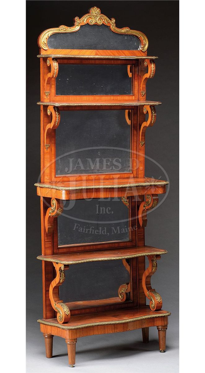 Second half 19th century, Continental. In two parts, the upper section fitted with two shaped shelves on S-scroll supports beneath the mirrored crest applied with scrolling foliate gilt metal mounts, the whole with book end matched veneers and crossbanding, the shelves separated by rectangular mirror plates, fitted to the lower section of three crossbanded shelves on scrolling supports, the edges with gilt mounts cast with leaf tips, raised on tapering cylindrical legs. the back panels fitted with two rectangular mirror plates. SIZE: 81" h x 31-1/2" w x 14" d. CONDITION: Very good overall with nicely polished surfaces. Two scrolled supports above the second shelf are missing lower scrolling. Top shelf of base with old shrinkage crack. 9-90194