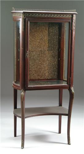 LOUIS XV-STYLE ORMOLU MOUNTED CURIO CABINET. This diminutive late 19th century French curio cabinet with bowed glass sides and rectangular glass door. Of mahogany with brass ormolu-type mounts and a delicate brass gallery on top. A shelf below; the cabinet with two removable plate-glass shelves. SIZE: 54in. h x 26in. w x 15in. d. CONDITION: A couple of imperfections on the molding; otherwise generally good. 9-26597