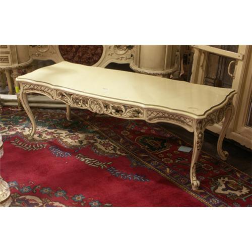 BENCH: Louis XV style painted and gilted bench, scalloped top above pierced and carved frieze raised on carved cabriole legs. 18''h x 20''d x 54''w