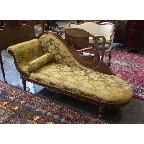 RECAMIER: Louis XVI style walnut recamier, crestrail carved with full swan, acanthus leaves.
